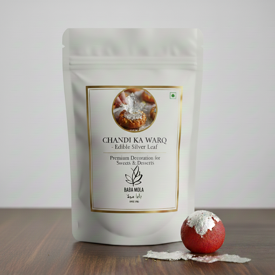 Elevate the presentation of your sweets and desserts with Chandi Ka Warq, 100% pure edible silver leaf used in traditional culinary decoration.